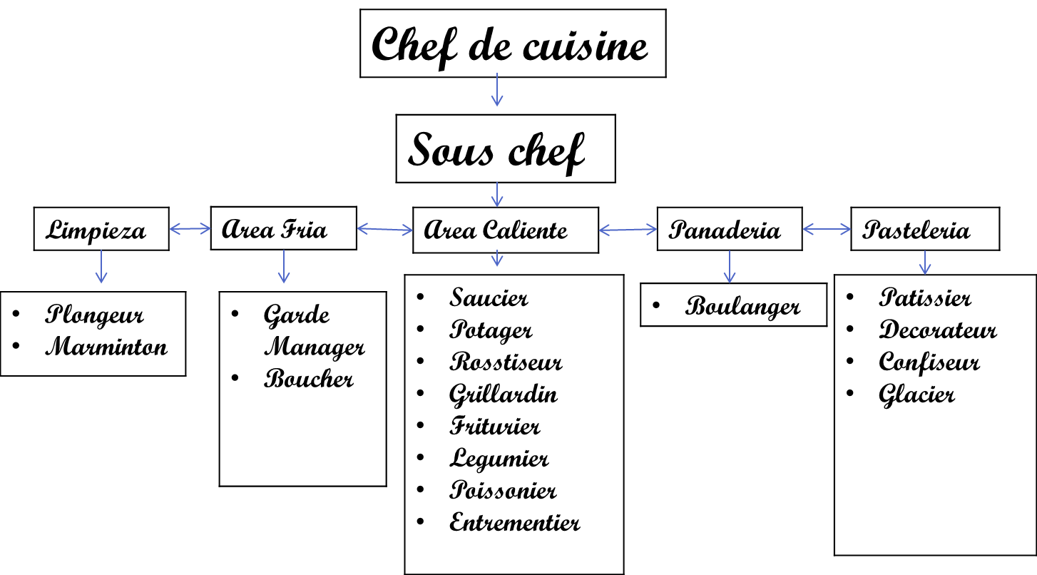 Dependiendo del establecimiento hostelero y del organigrama o jerarquía de . Jerarquía de funciones del curso Operación de restaurantes y bares. La jerarquía dentro de una cocina, el organigrama dentro de una cocina a nivel profesional, los distintos profesionales dentro de una cocina, .